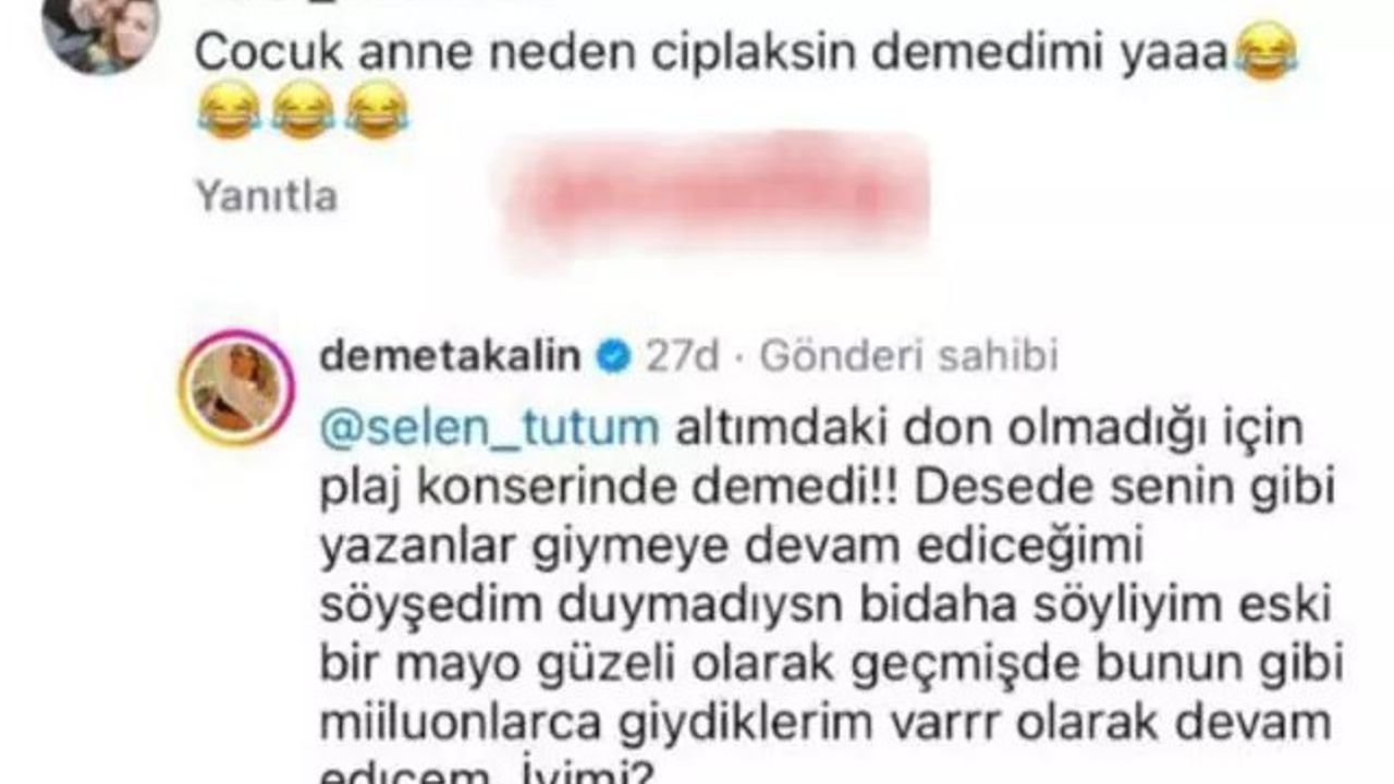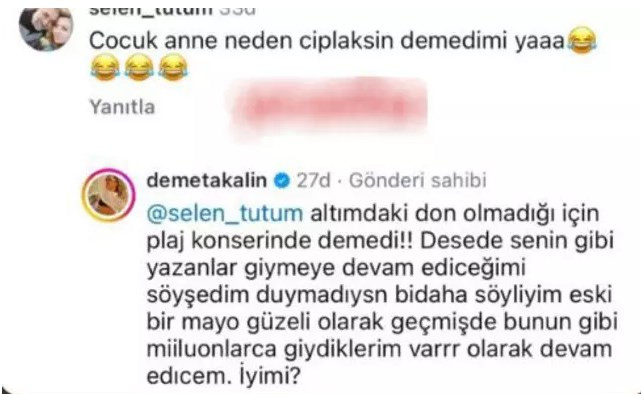 Akalın, bir takipçisinin “Çocuk, anne neden çıplaksın demedi mi?” yorumuna kayıtsız kalamadı ve “Altımdaki don olmadığı için plaj konserinde demedi…” yanıtını verdi.