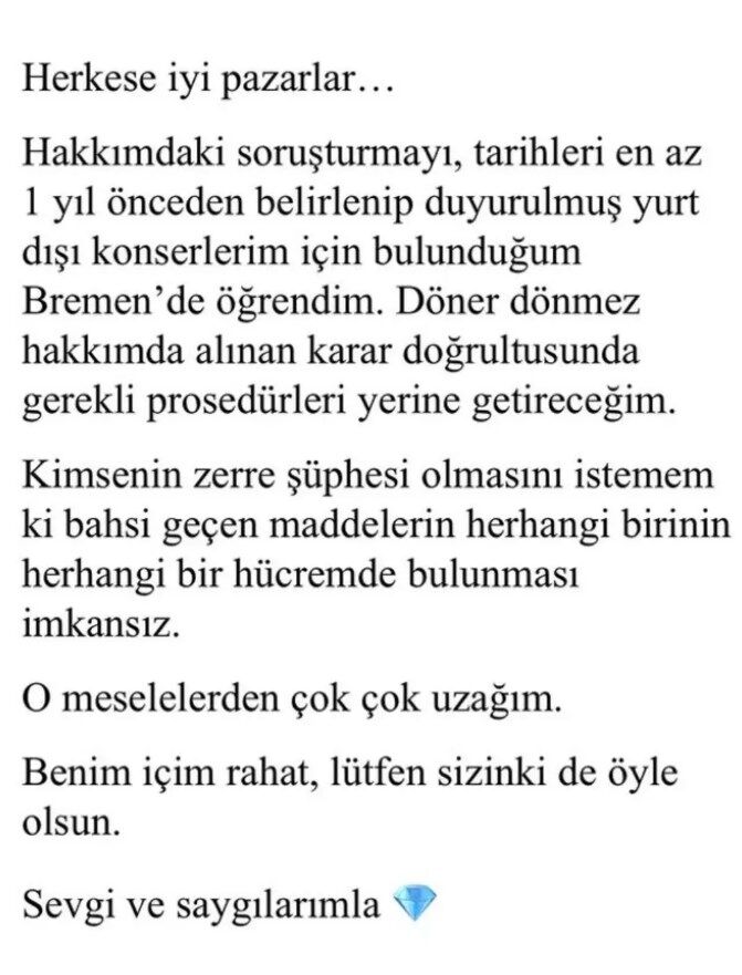 "Herkese iyi pazarlar... Hakkımdaki soruşturmayı, tarihleri en az 1 yıl önceden belirlenip duyurulmuş yurt dışı konserlerim için bulunduğum Bremen'de öğrendim."