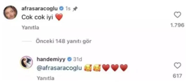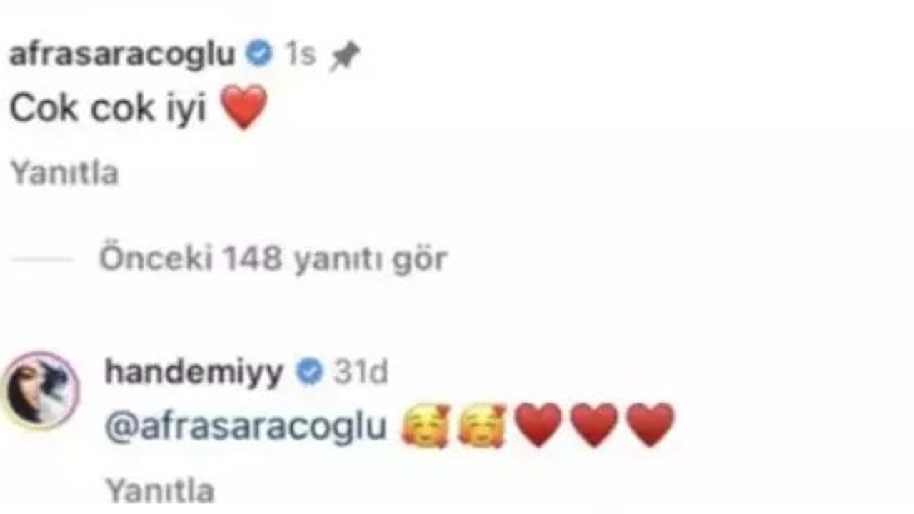 Afra Saraçoğlu, Hande Erçel'i paylaşan timelessmag'in gönderisinin altına "Çok çok iyi" yazıp kalp bıraktı. Hande Erçel'den de Saraçoğlu'na kalpler gecikmedi...