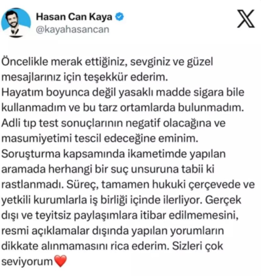 Hasan Can Kaya'dan ilk açıklama geldi. Kaya şunları ifade etti: