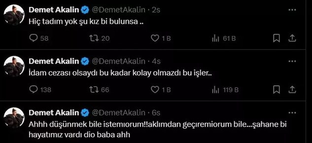 Akalın'ın bir sonraki paylaşımındaki "İdam cezası olsaydı bu kadar kolay olmazdı bu işler..." yorumu ise idam tartışmalarını yeniden alevlendirdi.