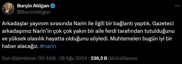Atılgan paylaşımında "Arkadaşlar yayınım sırasında Narin ile ilgili bir bağlantı yaptık. Gazeteci arkadaşımız Narin’in çok çok yakın bir aile ferdi tarafından tutulduğunu ve yüksek olasılık hayatta olduğunu söyledi. Muhtemelen bugün iyi bir haber alacağız." ifadelerini kullanmıştı.