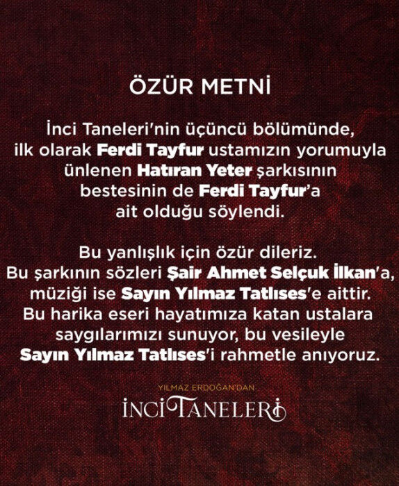 Dizinin Instagram hesabından "Özür metni" başlığıyla yayınlanan açıklamada "İnci Taneleri'nin üçüncü bölümünde ilk olarak Ferdi Tayfur ustamızın yorumuyla ünlenen Hatıran Yeter şarkısının bestesinin de Ferdi Tayfur'a ait olduğu söylendi. Bu yanlışlık için özür dileriz. Bu şarkının sözleri şair Ahmet Selçuk İlkan'a, müziği ise sayın Yılmaz Tatlıses'e aittir. Bu harika eseri hayatımıza katan ustalara saygılarımızı sunuyor, bu vesileyle sayın Yılmaz Tatlıses'i saygıyla anıyoruz" denildi.