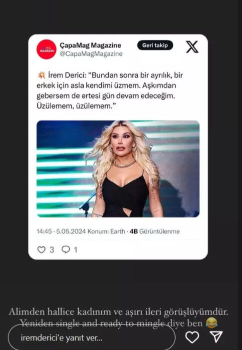 İrem Derici yaptığı son paylaşımda programdaki sözlerini alıntılayarak "Alimden hallice kadınım ve aşırı ileri görüşlüyümdür. Yeniden single and ready to mingle diye ben" yazdı.