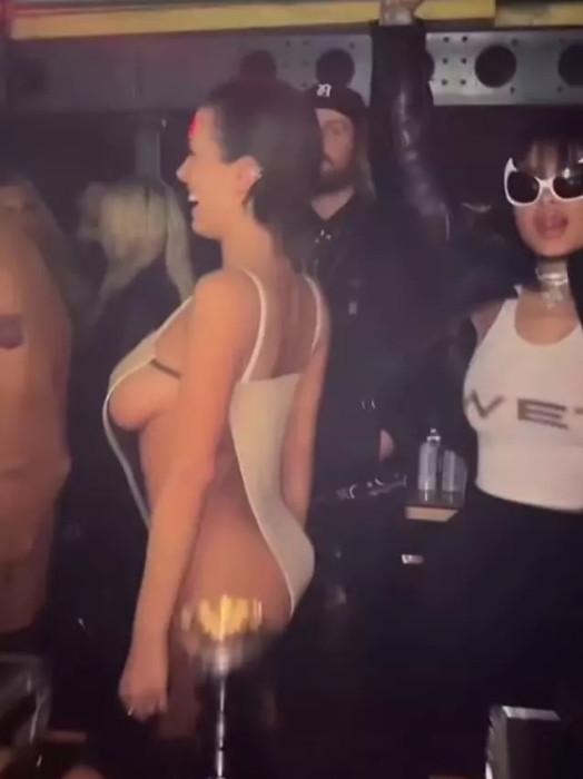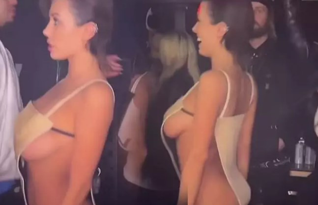İç çamaşırı olmadan giydiği giysi, eğlence arkadaşlarıyla dans ederken yıldızın vücudunun neredeyse tamamını ortaya çıkardı.