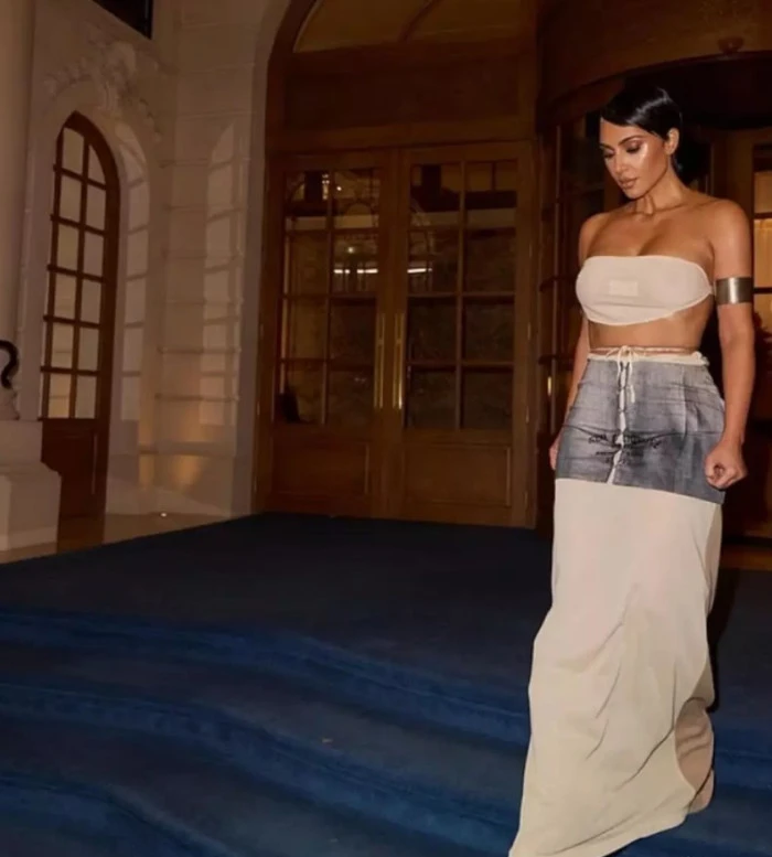 Kardashian, askısız krem tonlarında bir crop top ve uyumlu maxi etek tercih ederek cesur tarzını bir kez daha konuşturdu.