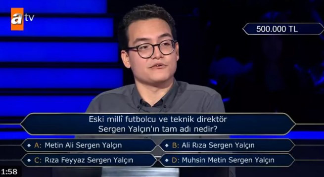 Yarışmadan çekilme cevabı alan yarışmacı, Ali Rıza Sergen Yalçın şıkkını düşündüğünü belirtti. Yarışmadan çekilen yarışmacı daha sonra ise cevap şıkkının doğru olduğunu görünce de büyük üzüntü duydu.