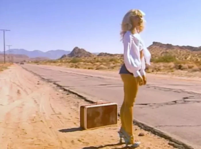 Carpenter videoda sarı saçlarını kıvırcık bırakmış, topuklu sandaletler giymiş. Çöl manzarası ve vintage tarzı görüntüler, profesyonel bir prodüksiyonu andırıyor.