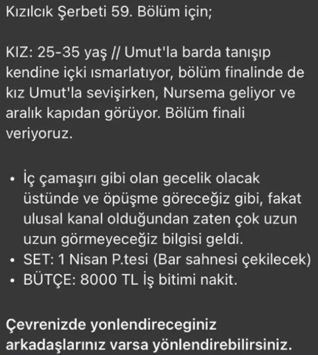 İç çamaşırı gibi olan gecelik olacak üstünde ve öpüşme göreceğiz gibi, fakat ulusal kanal olduğundan zaten çok uzun uzun göremeyeceğiz bilgisi geldi.' ifadelerine yer verildi. Bütçe olarak da 8 bin TL nakit verildi.