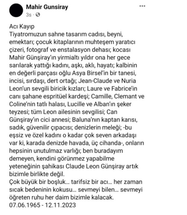 Acı haber hem Günşiray'ın hem de Tiyatro Oyunevi'nin sosyal medya hesabından yapılan paylaşımda şu ifadelere yer verildi: "Tiyatromuzun sahne tasarım cadısı, beyni, emektarı; çocuk kitaplarının muhteşem yaratıcı çizeri, fotoğraf ve enstalasyon dehası; kocası Mahir Günşiray'ın yirmialtı yıldır ona her gece sarılarak yattığı kadını, aşkı, aklı, hayatı; kalbinin en değerli parçası oğlu Asya Birsel'in bir tanesi, incisi, sırdaşı, dert ortağı; Jean-Claude ve Nuria Leon'un sevgili biricik kızları; Laure ve Fabrice'in canı şahane espritüel kardeşi; Camille, Clemant ve Coline'nin tatlı halası, Lucille ve Alban'ın şeker teyzesi; tüm Leon ailesinin sevgilisi; Can Günşiray'ın cici annesi; Baluna'nın kaptan karısı, sadık, güvenilir çıpacısı; denizlerin meleği; bu eşsiz ve özel kadını o kadar çok seven arkadaşı var ki, karada denizde havada, üç cihanda-, onların hepsinin unutulmaz varlığı; ben buradayım demeyen, kendini görünmez yapabilme yeteneğinin şahikası Claude Leon Günşiray artık bizimle birlikte değil. Çok büyük bir boşluk… Tarifsiz bir acı… Her zaman sıcak bedeninin kokusu… Sevmeyi bilen… Sevmeyi öğreten ruhu her daim bizimle kalacak."