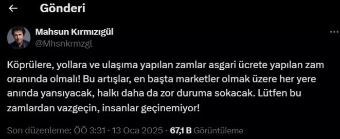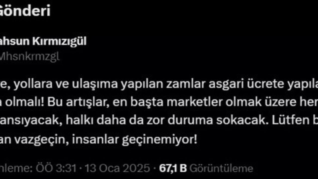 "Köprülere, yollara ve ulaşıma yapılan zamlar asgari ücrete yapılan zam oranında olmalı! Bu artışlar, en başta marketler olmak üzere her yere anında yansıyacak, halkı daha da zor duruma sokacak. Lütfen bu zamlardan vazgeçin, insanlar geçinemiyor!"