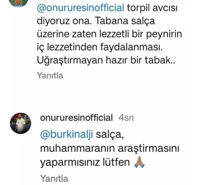 Şeflerin övmelere doyamadığı tabağına ise sosyal medyada bir kullanıcı 'Torpil avcısı diyoruz. Tabana salça üzerine zaten peynirin iç lezzetinden faydalanması...Uğraştırmayan bir tabak." dedi. Bunu gören Beyza'nın savunucusu Onur da Beyza'yı bu yoruma karşı destekledi. "Muhammaranın araştırmasını yapar mısın lütfen" yanıtını verdi.