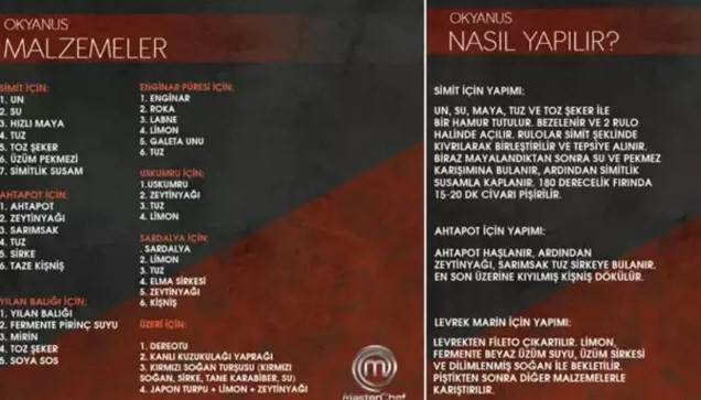 "Öncelikle bir tane simit yapacaksınız. Devamında ahtapot, ahtapotu güzelce pişiriyorsunuz, yarım pişmiş olarak verdik. Zeytinyağı, sarımsak, tuz, sirke ve taze kişniş, kişniş saplarıyla ahtapotumuzu pişiriyoruz. Daha sonra size bütün levrekler verdik, levrekleri açıyorsunuz. Levrekleri açtıktan sonra bütün filota yapıp, levrek marin yapıyorsunuz. Yani bütün sosunu hazırlıyorsunuz, levreği bütün yapıyorsunuz. Bütün olarak sosluyorsunuz, onu da kenara alıyorsunuz. Daha sonra yılan balığı, bu biraz zor. Bu arada prodüksiyonu ve ekibini tebrik ediyoruz. Yılan balığını sizin için Adana'dan getirdiler. Yılan balığı, sardalya var. Uskumruyu fırına koyun. Uskumruyu derilerini ve kılçığını ayıklayın. Ondan sonra zaten bembeyaz oluyor. Met şeklinde kesip buraya koyacağız. Sardalya'yı sıfır kılçık haline getiriyorsunuz. Ortadaki kılçığı alıyoruz. Ondan sonra yaklaşık üç ya da dört dakika limon, tuz, elma sirkesi, zeytinyağı ve yine biraz kişnişle beraber, sapıyla beraber tatlandırıyorsunuz. Bu arada levrek için de kişnişi toz olarak istiyoruz."