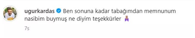 Uğur Kardaş'ın paylaşımını beğenenler arasında Tahsin Küçük de yer aldı. Yarışmacı arkadaşlarından Ayaz Geçer ise iyi dileklerde bulundu.