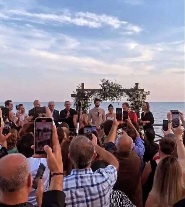 Melek Mosso gelinliğini straplez model tercih ederken Serkan Sağdıç damatlık seçiminde tercihini bej renginden yana kullandı.