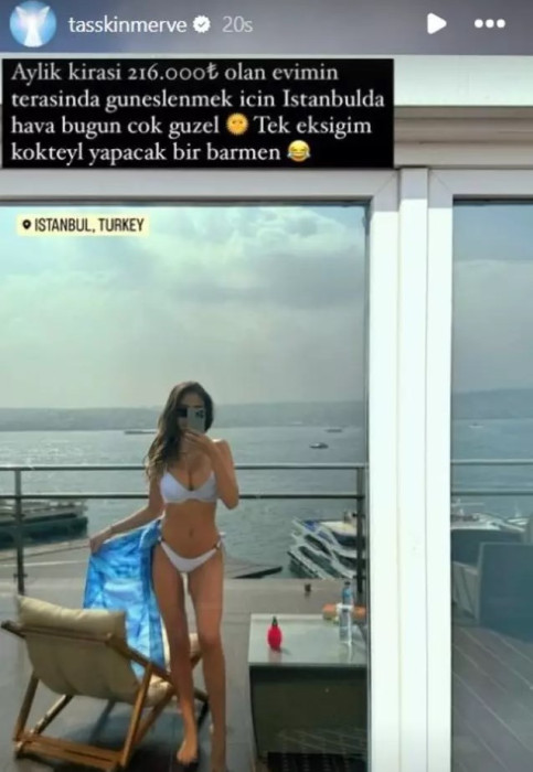 "Aylık kirası 216 bin TL olan evimin terasında güneşlenmek için İstanbul'da hava çok güzel" diyen Merve Taşkın beyaz bikinisiyle poz verdi.