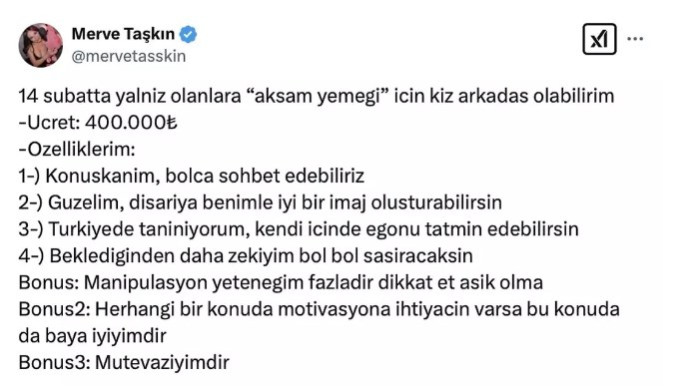 Aktif olarak kullandığı X hesabında Merve Taşkın, 14 Şubat'ta yalnız olanlar için ücret karşılığında akşam yemeği teklif etti. 400 Bin TL karşılığında kız arkadaş olacağını söyledi. Ayrıca Taşkın, özelliklerini sıralayıp cinsiyetin fark etmediğini belirtti.