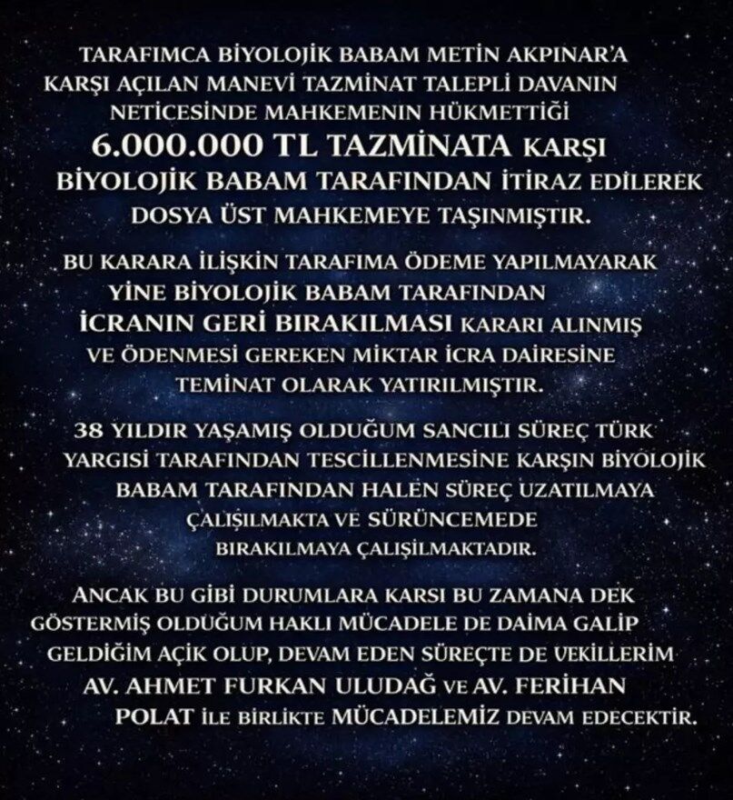 Duygu Nebioğlu, yaptığı açıklamada şu ifadelere yer verdi: Tarafımca biyolojik babam Metin Akpınar'a karşı açılan manevi tazminat talepli davanın neticesinde mahkemenin hükmettiği 6.000.000 TL tazminata karşı biyolojik babam tarafından itiraz edilerek dosya üst mahkemeye taşınmıştır.