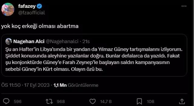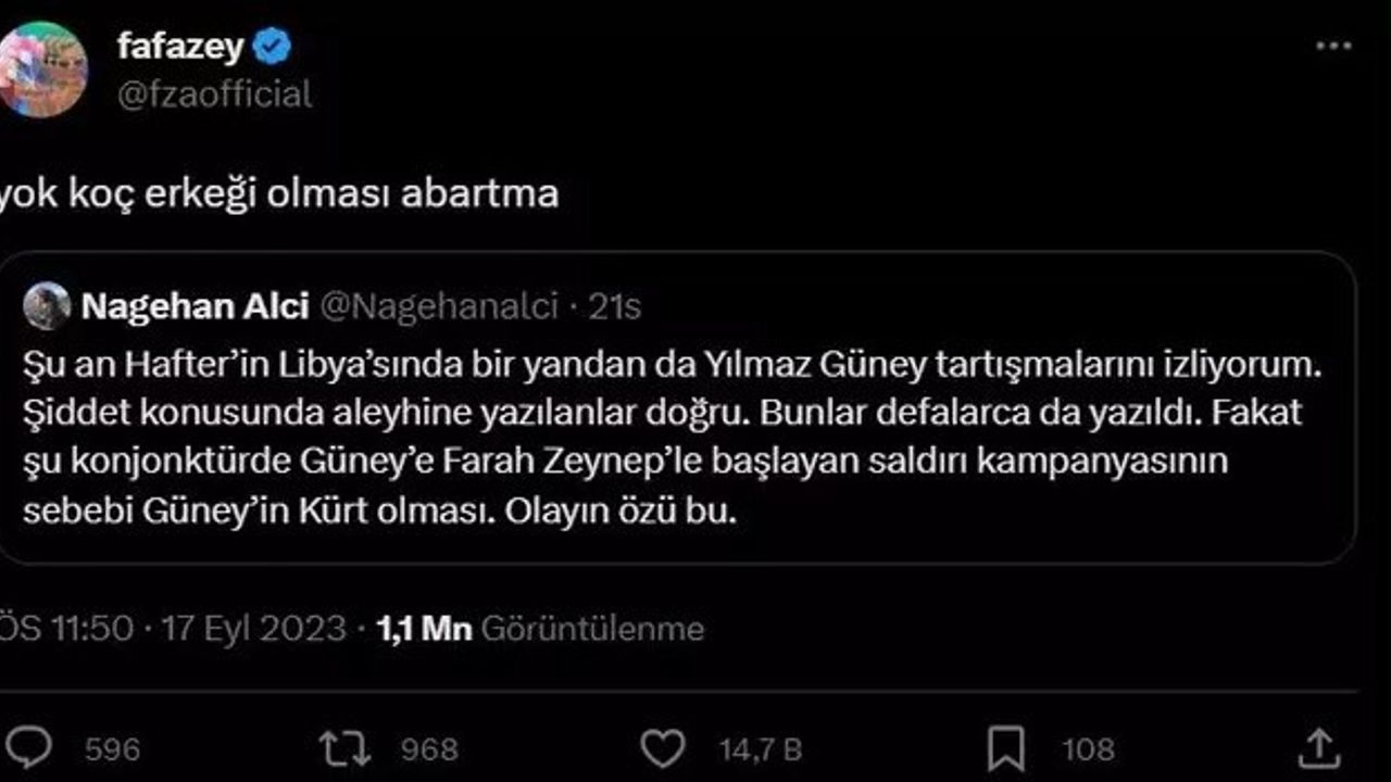 Nagehan Alçı da konuya sessiz kalmadı ve "Şu an Hafter’in Libya’sında bir yandan da Yılmaz Güney tartışmalarını izliyorum. Şiddet konusunda aleyhine yazılanlar doğru. Bunlar defalarca da yazıldı. Fakat şu konjonktürde Güney’e Farah Zeynep’le başlayan saldırı kampanyasının sebebi Güney’in Kürt olması. Olayın özü bu" dedi.