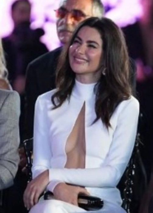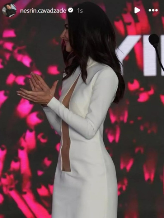 Geceye beyazlar içerisinde katılan Nesrin Cavadzade'nin boynundan göbek altına kadar olan derin göğüs dekoltesi dikkat çekti. Ünlü ismin dekoltesine kimse anlam veremedi.