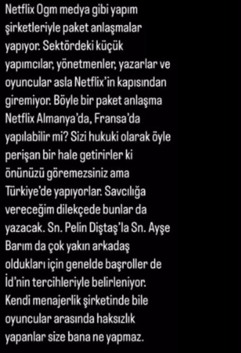 Sosyal medya hesabından dikkat çeken paylaşımlarda bulunan Aydın, Netflix’in başındaki isim Pelin Diştaş ve ekibinin hep aynı yapımcılarla çalıştığını iddia etti.