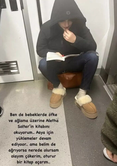 Vuslateri yolculuk sırasında yere oturup kitap okudu. O anları ise şu sözlerle paylaştı: "Ben de bebeklerde öfke ve ağlama üzerine Aletha Solter'in kitabını okuyorum. Asya için yüklemeler devam ediyor ama belim de ağrıyorsa nerede olursam olayım çökerim, oturur bir kitap açarım."