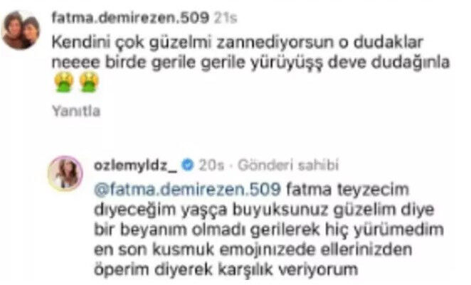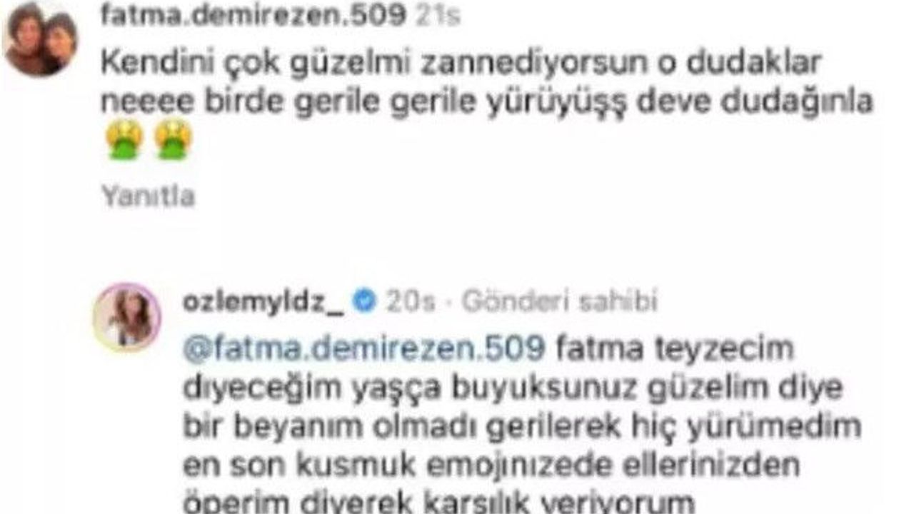 Özlem Yıldız bu yoruma kayıtsız kalamadı ve 'Fatma teyzecim diyeceğim yaşta büyüksünüz güzelim diye bir beyanım olmadı, gerilerek hiç yürümedim. En son kusmuk emojilerinize de ellerinizden öperim diyerek karşılık veriyorum' dedi. Ünlü isim takipçisine verdiği bu yanıtla kısa sürede gündem oldu.