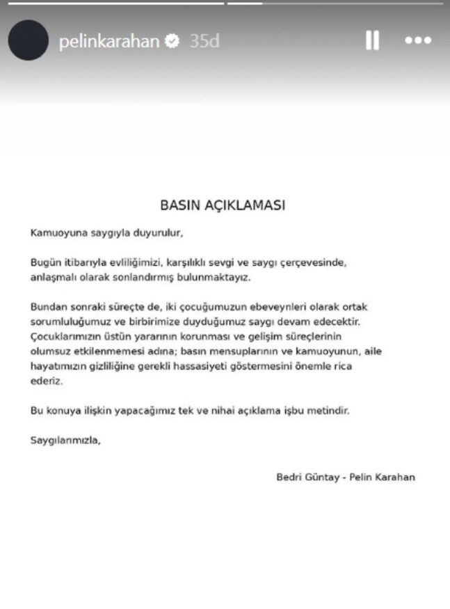 Bugün itibarıyla evliliğimizi, karşılıklı sevgi ve saygı çerçevesinde, anlaşmalı olarak sonlandırmış bulunmaktayız. Bundan sonraki süreçte de, iki çocuğumuzun ebeveynleri olarak ortak sorumluluğumuz ve birbirimize duyduğumuz saygıyı devam ettireceğiz. Çocuklarımızın üstün yararının korunması ve gelişim süreçlerinin olumsuz etkilenmemesi adına; basın mensuplarının ve kamuoyunun, aile hayatımızın gizliliğine gerekli hassasiyeti göstermesini önemle rica ederiz."