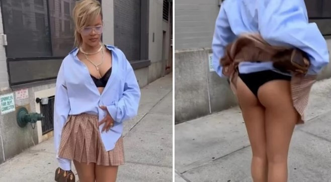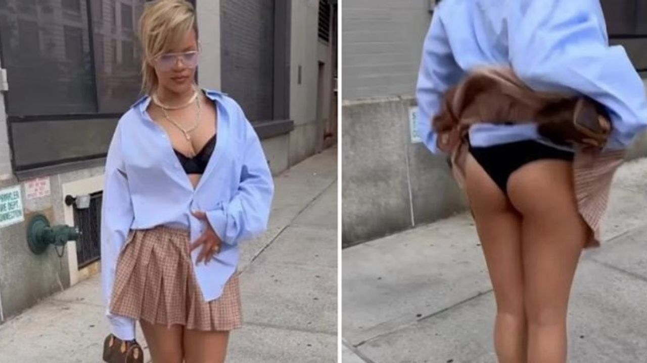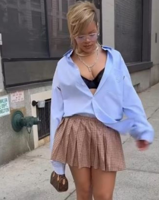 36 yaşındaki şarkıcı, 2,250 dolarlık Miu Miu mini etek ve mavi gömlek giydi. Videoda kısa bir an siyah iç çamaşırını gösterdi. Gömleğinin altından kendi markası Savage X Fenty'nin siyah sütyeni görünüyordu.