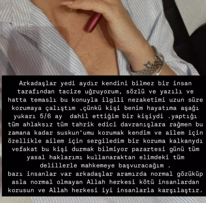 "7 aydır kendini bilmez bir insan tarafından tacize uğruyorum. Sözlü ve yazılı hatta temaslı... Bu konuyla ilgili nezaketimi uzun süre korumaya çalıştım çünkü kişi benim hayatıma aşağı yukarı 5 - 6 ay dahil ettiğim bir kişiydi. Yaptığı tüm ahlaksız tüm tahrik edici davranışlara rağmen bu zamana kadar suskunluğumu korumak, kendim ve ailem için özellikle ailem için sergilediğim bir koruma kalkanıydı. Fakat bu kişi durmak bilmiyor."