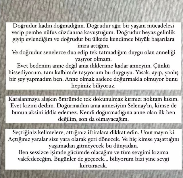 Cinsiyet değiştirdiğini her fırsatta hakaret gibi gündeme getirilen Selin Ciğerci açıklamasında "Doğrudur kadın doğmadığım. Doğrudur ağır bir yaşam mücadelesi verip pembe nüfus cüzdanına kavuştuğum... Ve doğrudur senelerce dua edip tek tatmadığım duygu olan anneliği yaşıyor olmam. Evet bedenim anne değil ama iliklerime kadar anneyim" dedi.