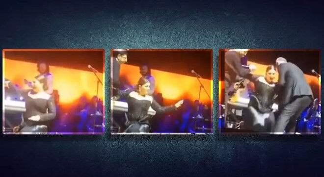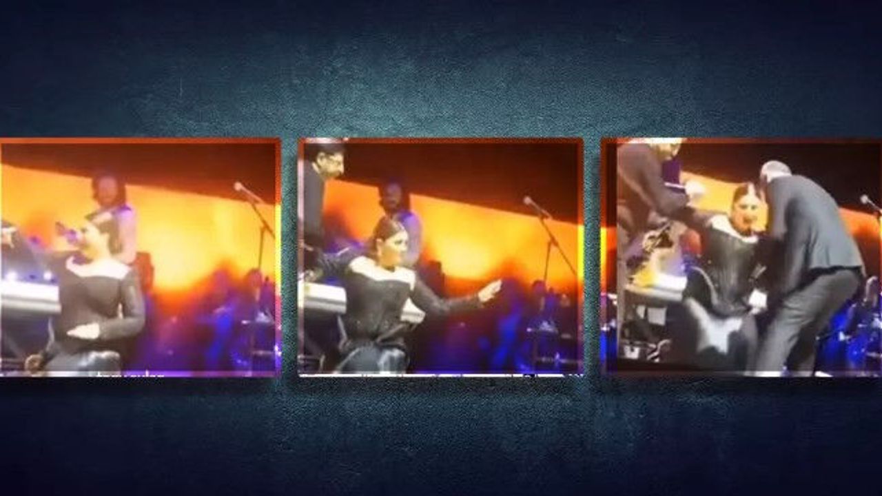Amor Gariboviç imzalı siyah elbisesiyle dile düşen Sibel Can sahnede zor anlar yaşadı.