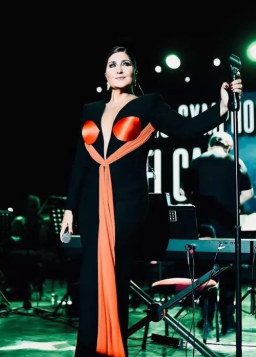 Siyah ve turuncu detaylara sahip elbisenin göğüs kısmına bir bakan bir daha baktı. Şarkıcının tarzına kimse anlam veremedi.