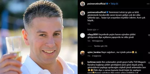 Erçetin geçtiğimiz gün ise eşinin ölüm haberini duyurdu. Ani ölümle sarsılan eski manken sosyal medyadan eşinin fotoğrafını paylaşarak "Yeminimizi tuttuk iyi gün ve kötü günümüzde beraberdik canım kocam gidişin çok âni oldu ışıklarda uyu… Taziye için arayanlara teşekkür ederim. Acım çok büyük" ifadelerini kullandı.