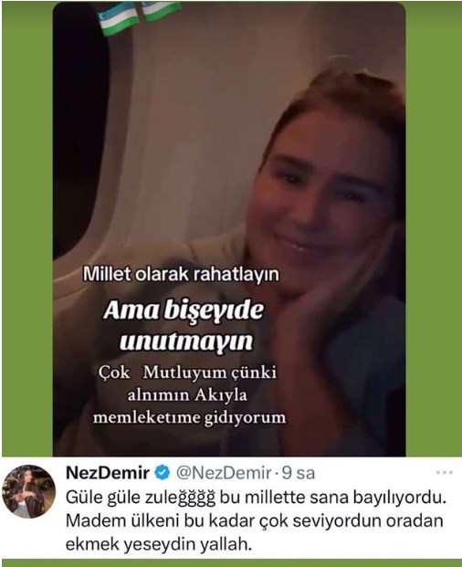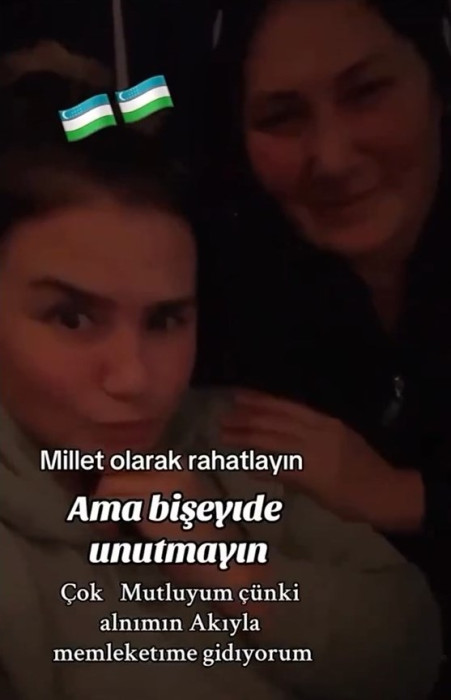 TikTok hesabından çektiği videolarla tanınan Şule, ülkesine giderken de paylaşım yapmadan duramadı. Uçakta çektiği videoları yayınlayarak Türkiye'den gittiğini duyuran Şule, "Millet olarak rahatlayın ama bir şeyde unutmayın. Çok mutluyum çünkü alnımın akıyla memleketime gidiyorum" ifadelerini kullandı. Şule'nin bir fotoğrafında akrabası Nargiza K. da görüldü.