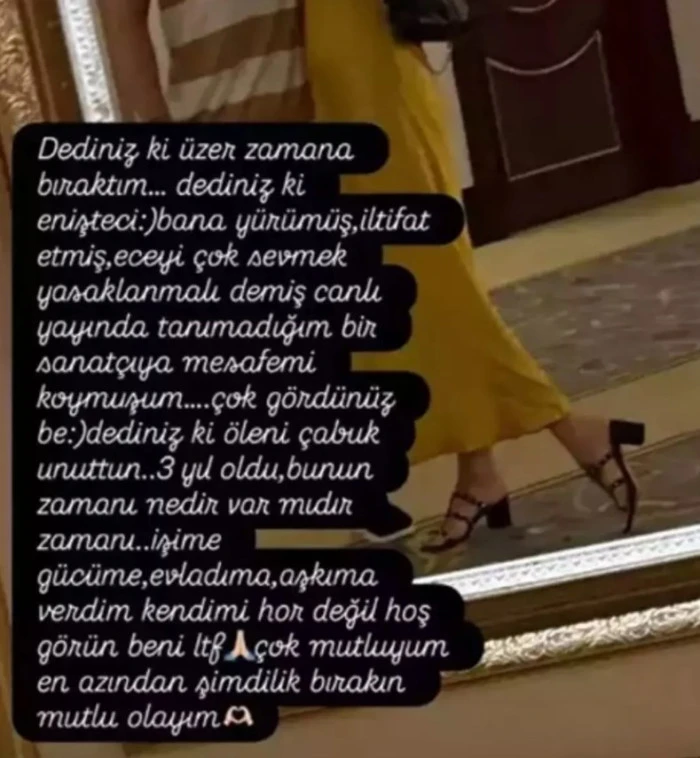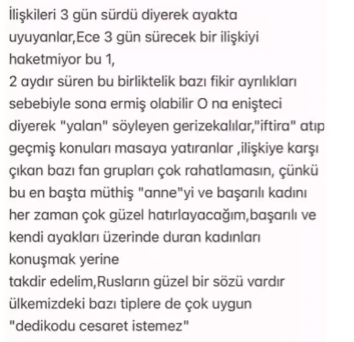 "İlişkileri 3 gün sürdü diyerek ayakta uyuyanlar, Ece 3 gün sürecek bir ilişkiyi hak etmiyor bu 1- 2 aydır süren bu birliktelik bazı fikir ayrılıkları sebebiyle sona ermiş olabilir. Ona enişteci diyerek "yalan" söyleyen gerizekalılar, "iftira" atıp geçmiş konuları masaya yatıranlar, ilişkiye karşı çıkan bazı fan grupları çok rahatlamasın, çünkü bu en başta müthiş "anne"yi ve başarılı kadını her zaman çok güzel hatırlayacağım. Başarılı ve kendi ayakları üzerinde duran kadınları konuşmak yerine takdir edelim. Rusların güzel bir sözü vardır; ülkemizdeki bazı tiplere de çok uygun "dedikodu cesaret istemez" ifadelerini kullandı.