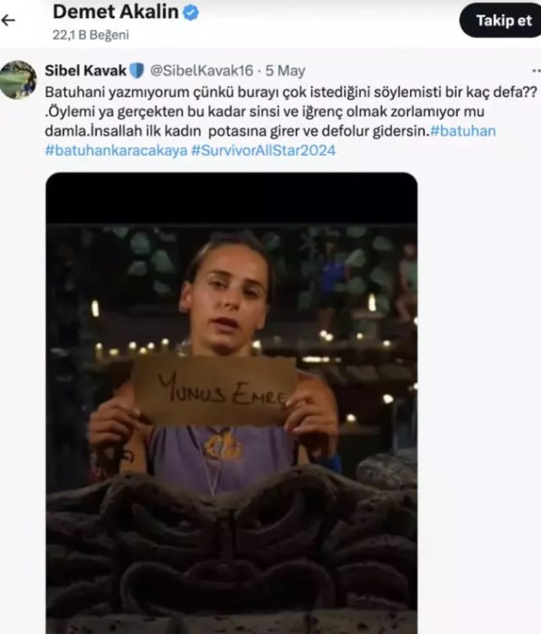 Damla Can'a karşı hislerini bilmediğimiz Akalın, meğer ondan da hoşlanmıyormuş. Akalın, Twitter hesabından Damla Can'a "Bu kadar sinsi ve iğrenç olmak zorlamıyor mu Damla? İnşallah ilk kadın potasına girer ve defolur gidersin." tweetini beğenerek yine olay yarattı.