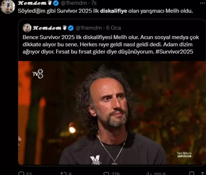 Survivor'da biliyorsunuz sakatlık en büyük belalardan biri. Maalesef Melih Survivor'a veda etti. Yarın veda içim kampa gelecek. Sizinle vedalaşacak. Erken bir veda oldu. Ama biliyorsunuz bu tip vedalar maalesef olabilir. Her sene de oluyor zaten. Kendisine teşekkür ediyoruz.''