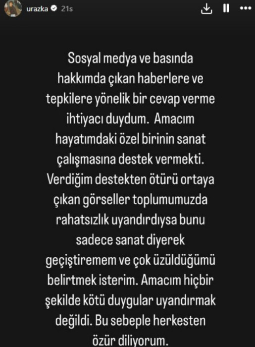 Pozlarından dolayı sosyal medyada gündem olan Uraz Kaygılaroğlu, Instagram hesabından yaptığı paylaşımda "Sosyal medyada ve basında hakkımda çıkan haberlere ve tepkilere yönelik bir cevap verme ihtiyacı duydum. Amacım hayatımdaki özel birinin sanat çalışmasına destek vermekti. Verdiğim destekten ötürü ortaya çıkan görseller toplumumuzda rahatsızlık uyandırdıysa bunu sadece sanat diyerek geçiştiremem ve çok üzüldüğümü belirtmek isterim. Amacım hiçbir şekilde kötü duygular uyandırmak değildi. Bu sebeple herkesten özür diliyorum. Saygılarımla" ifadelerini kullandı.