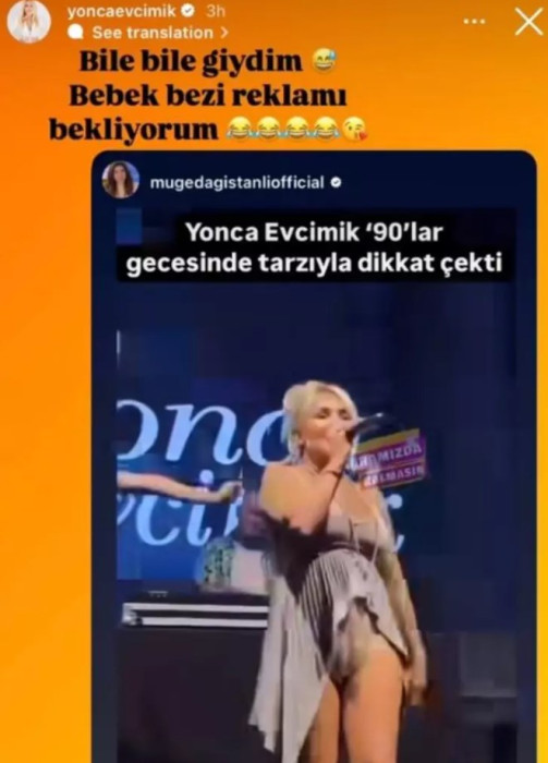 Yonca Evcimik ise tarzıyla ilgili yorumları ti'ye alarak "Bile bile giydim. Bebek bezi reklamı bekliyorum" dedi.