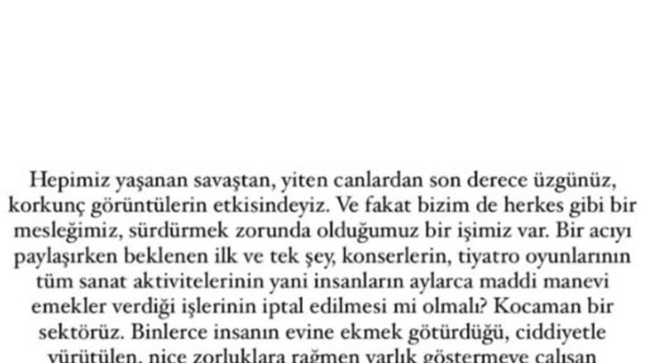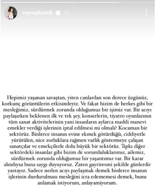 Bastık, sosyal medya hesabından yaptığı paylaşımda şu ifadeleri kullandı: "Hepimiz yaşanan savaştan, yiten canlardan son derece üzgünüz, korkunç görüntülerin etkisindeyiz. Ve fakat bizim de herkes gibi bir mesleğimiz, sürdürmek zorunda olduğumuz bir işimiz var. Bir acıyı paylaşırken beklenen ilk ve tek şey, konserlerin, tiyatro oyunlarının tüm sanat aktivitelerinin, yani insanların aylarca maddi manevi emekler verdiği işlerinin iptal edilmesi mi olmalı?