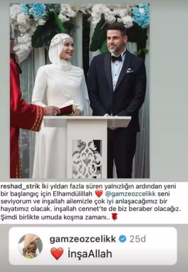Reshad Strik ile düğünden bir karelerini paylaşarak "İki yıldan fazla süren yalnızlığın ardından yeni bir başlangıç için Elhamdülillah. Seni seviyorum ve inşallah ailemizle çok iyi anlaşacağımız bir hayatımız olacak. inşallah cennette de biz beraber olacağız.
