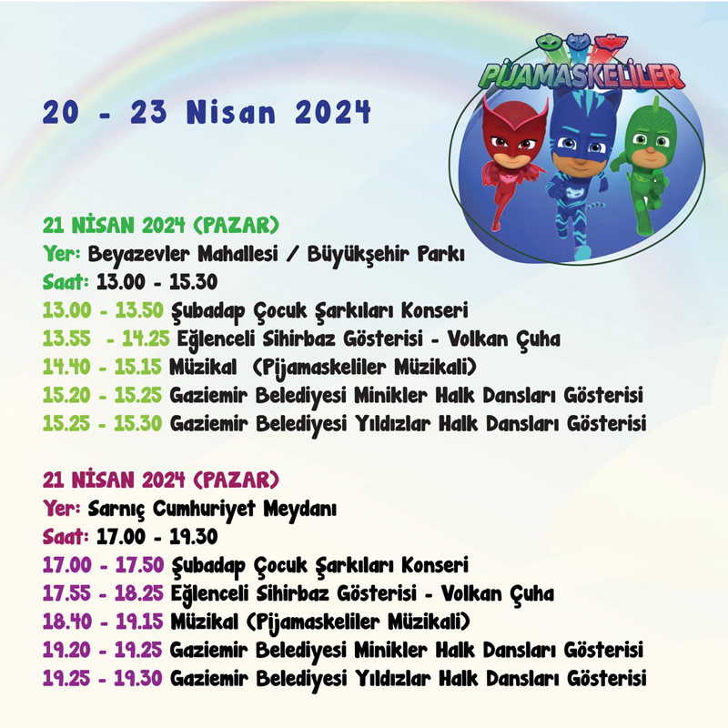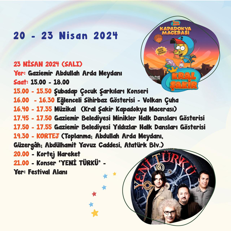 Gaziemir Belediyesi'nin 23 Nisan Ulusal Egemenlik ve Çocuk Bayramı kutlamaları kapsamında düzenleyeceği 26. Gaziemir Ulusal Çocuk Şenliği başlıyor. 20-23 Nisan tarihlerinde düzenlenecek şenlik kapsamında her gün ilçenin farklı bir bölgesinde çocuklar için etkinlikler düzenlenecek. Şenlikte sahnelenecek müzikallerle, çocuklar sevdikleri çizgi film kahramanlarıyla bir araya gelecek. Kukuli, Pijamaskeliler, Aslan, Kral Şakir Kapadokya Macerası gibi müzikal gösterileriyle ve Şubadap Çocuk Şarkıları Konseri, Volkan Çuha Eğlenceli Sihirbaz Gösterisi'yle çocuklar keyifli saatler yaşayacak. Gaziemir Belediyesi Halk Dansları Topluluğu'nun minikler ve yıldızlar grupları da danslarıyla şenliğe renk katacak.