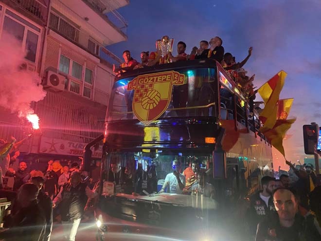 Taraftarlar Mithatpaşa Caddesi'nde otobüsü meşalelerle karşıladı. Havai fişek gösterileriyle gece renklenirken, ortalık 'Şampiyon Göztepe' tezahüratları ile inledi. Futbolcular da şampiyonluk kupasıyla taraftarı selamladı.