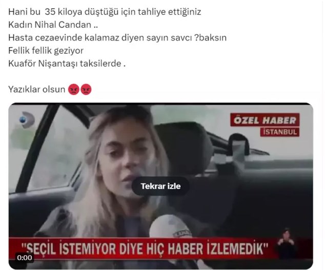 "Hani bu 35 kiloya düştüğü için tahliye ettiğiniz kadın Nihal Candan... Hasta, cezaevinde kalamaz diyen sayın savcı? Baksın fellik fellik geziyor. Kuaför, Nişantaşı taksilerde..."