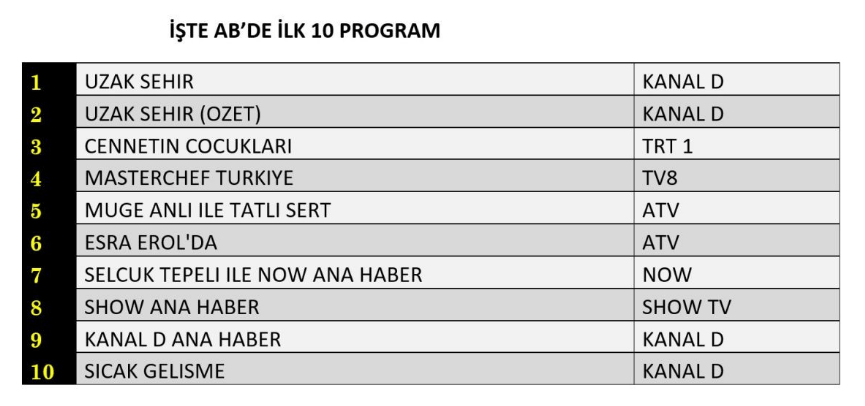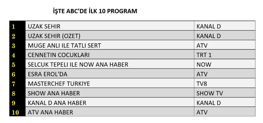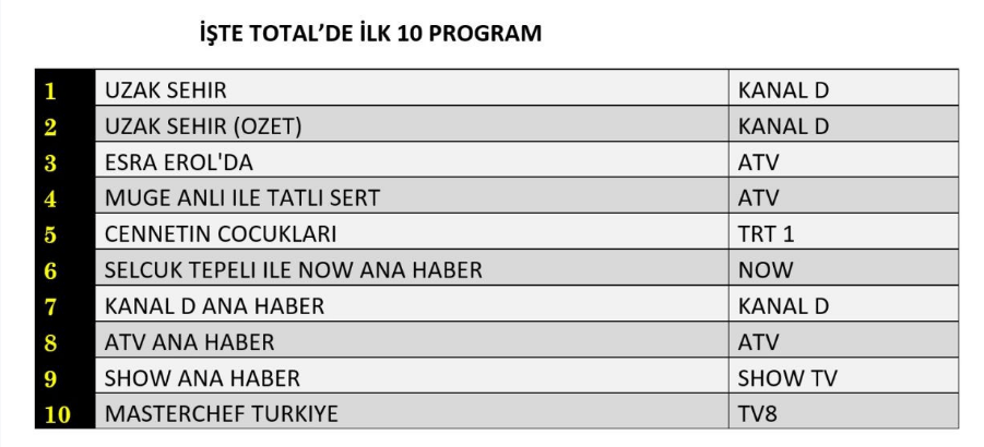 13 Ekim Pazartesi günü televizyon ekranlarında en çok izlenen yapımlar belli oldu. “Uzak Şehir” tüm gruplarda zirvede yer aldı. İşte Total, AB ve ABC gruplarında ilk üç sıralama…