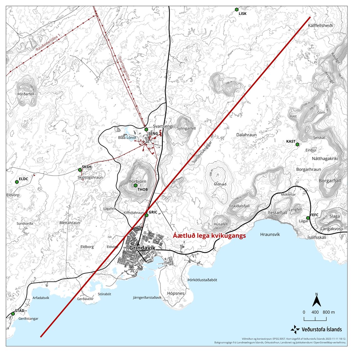 İzlanda Meteoroloji Ofisi’nden yapılan açıklamada, “Elde edilen veriler, magma tünelinin boyutunun önemli olduğunu ve magmanın yüzeye yaklaştığını göstermektedir. Koridor kuzeyde Kalfellsheidi'den başlayıp Grindavik'in batısına ve güneybatı yönünde denize doğru uzanmaktadır. Magma tüneli yaklaşık 15 kilometre uzunluğundadır ve magma en sığ olduğu yerde yaklaşık 800 metre derinliktedir. Veriler yaklaşık 12 saatlik uydu verilerine dayandığına dikkat edilmelidir, bu nedenle magmanın yüzeye 800 metreden daha yakın hareket ettiği varsayılmalıdır. Ayrıca magmanın okyanus tabanında ortaya çıkma ihtimali de yüksektir” denildi.