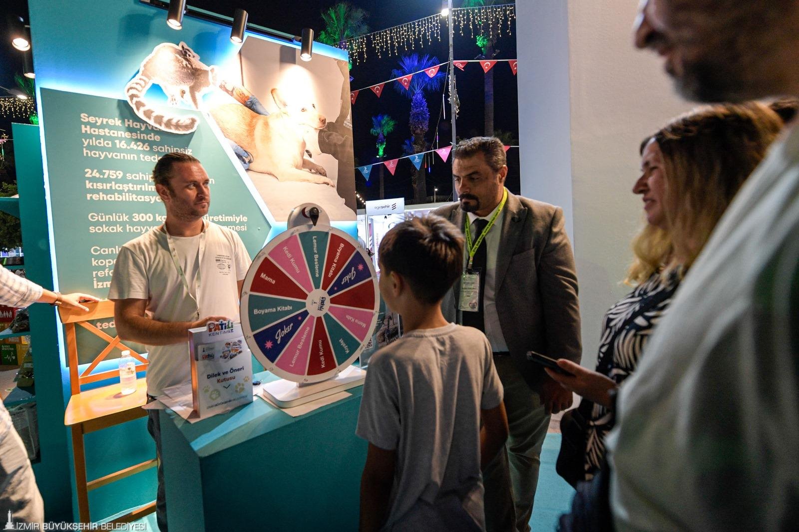 İzmir Büyükşehir Belediyesi Veteriner İşleri Dairesi Başkanlığı Hayvan Sağlığı Şube Müdürlüğü’nde görevli Mithat Yıldırım, standa ilginin çok yoğun olduğunu söyledi. Yurttaşların hayvanları çok sevdiğini belirten Yıldırım, “Hediye çarkını çevirenlere, kendi ürettiğimiz mamaları hediye olarak veriyoruz. Yine hediyelerimiz arasında sokak hayvanları için kıyafet ve Doğal Yaşam Parkı’nda bulunan hayvanların yer aldığı boyama kitabı var” dedi.