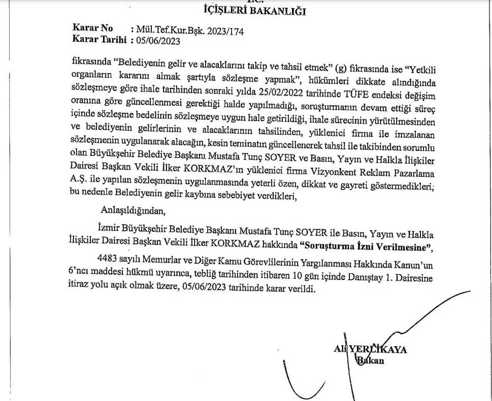 İhale sürecinin yürütülmesinden ve belediyenin gelirlerinin ve alacaklarının tahsilinden, yüklenici firma ile imzalanan sözleşmenin uygulanarak alacağın tahsil ve takibinden sorumlu olan Büyükşehir Belediye Başkanı Tunç Soyer ve Basın Yayın Halkla İlişkiler Daire Başkanvekili İlker Kozan’ın yeterli özen, dikkat ve gayreti göstermedikleri ve bu nedenle belediyenin gelir kaybına sebebiyet verdikleri anlaşılmaktadır. Bu nedenle iki isme soruşturma izni verilmesine karar verildi’ (Ercan ÖZTÜRK / MasterHaber)