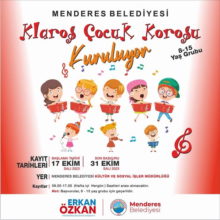 Menderes Belediyesi Kültür ve Sosyal İşler Müdürlüğü tarafından sürdürülen çalışmalar kapsamında Klaros Çocuk Korosu için kayıt dönemi başladı. Ücretsiz kurs için 8-15 yaş arasındaki tüm çocuklar başvuru yapabilecek. Koroya son kayıt tarihi ise 31 Ekim olarak belirlendi.
